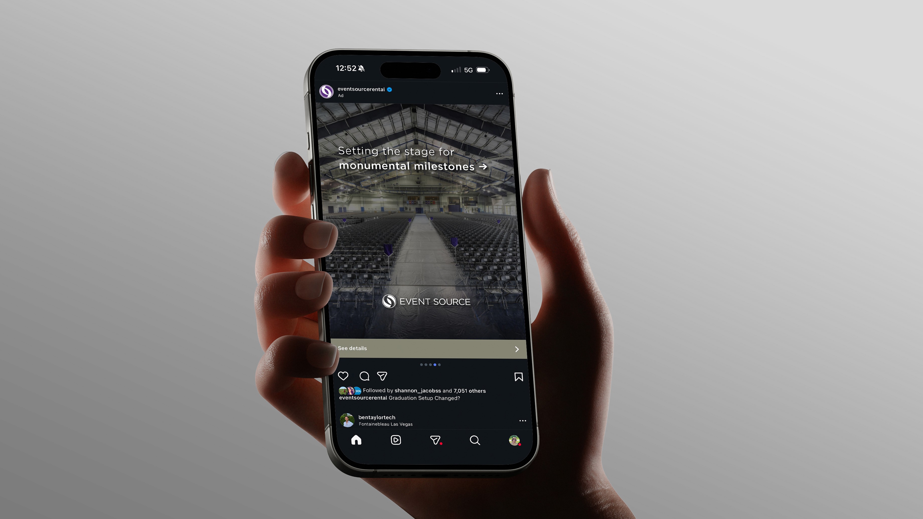 I produced 100+ unique creative assets across Event Source, Panache Events, and So Cool Events for Q1 2026 — spanning static, carousel, reel, and Google P-Max video formats. Each brand maintained a distinct visual identity while sharing a consistent production standard. Top-performing creative drove up to 6,148 landing page views from a single carousel, $0.32–$0.35 cost per result across traffic campaigns, and 102 inbound calls at $14.02 cost per call on Panache Events Meta. Video assets were shot and edited in-house, keeping the creative process end to end.