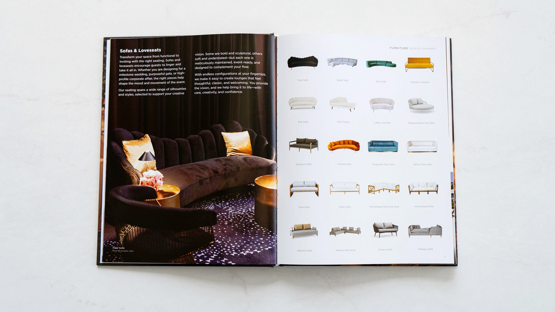 The catalogs for Event Source, Panache Events, and So Cool Events had no formal design foundation — no grid, no style system, no print standards. I rebuilt them from scratch in InDesign, developing a unified grid, comprehensive paragraph and character style library, and master frame architecture designed for efficient annual updates. I shot original photography specifically for the layouts, managing thousands of linked assets across 100+ pages and 1,000+ products. 3,000 units printed and delivered, now serving as the centerpiece of Q2 client outreach.